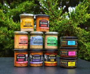 Achards au citron, Houmous du vignoble, Carotte citronnelle, Courgette coco curry, Sardines citron, Sardines piment et poivrons, Rillettes de sardine au beurre de baratte, Sardines yuzu poivre timut, Sardines tomate et pesto, Maquereau poire et cumin, Thon moules curry.